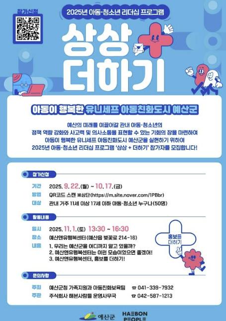 ‘상상+더하기 아동·청소년 리더십 프로그램’은 11월 1일 오후 1시 30분, 예산앤유행복센터에서 열릴 예정이며, 참가자들은 아동친화도시에 대한 이해를 바탕으로 아이디어 발굴, 정책 제안 등 다양한 참여형 활동에 참여할 예정이다.