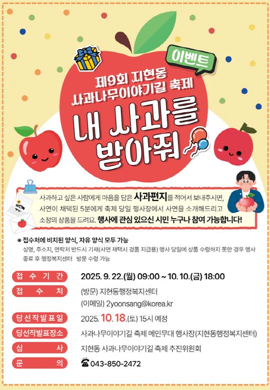 [무한뉴스=정민정 기자] 충주시 지현동행정복지센터는 사과나무이야기길축제 추진위원회가 주관하는 ‘제9회 지현동 사과나무이야기길 축제’ 사전홍보를 위해 ‘내 사과를 받아줘 : 사과데이’ 이벤트를 진행한다고 22일 밝혔다.