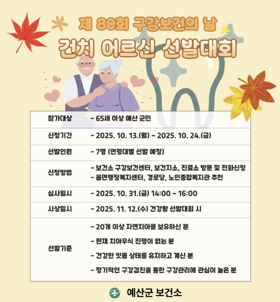 [무한뉴스=정민정 기자] 예산군보건소는 ‘제80회 구강보건의 날’을 맞아 건강하고 활기찬 구강생활 실천 분위기 조성을 위해 건치(건강한 치아)어르신 선발대회를 개최한다.