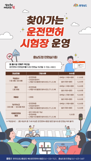 찾아가는 운전면허시험장은 한국도로교통공단 예산운전면허시험장과 협력해 운전면허 관련 민원 업무를 도청 민원실에서 직접 처리하는 서비스로, 내포신도시 인근 거주 도민들에게 큰 호응을 얻고 있다.