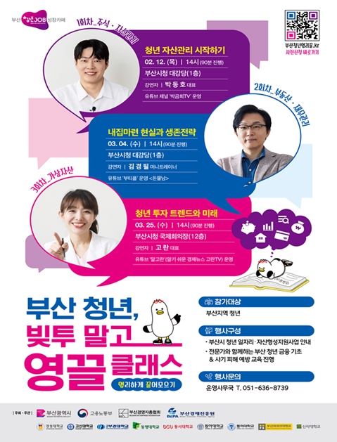[무한뉴스=최진수 기자] 부산시는 급변하는 금융 환경 속에서 지역 청년들이 올바른 자산관리를 통해 경제적 자립 기반을 다질 수 있도록 오는 2월 12일부터 총 3회에 걸쳐 '부산청년, 빚투 말고 영끌(영리하게 끌어모으기) 클래스'를 개최한다고 밝혔다.