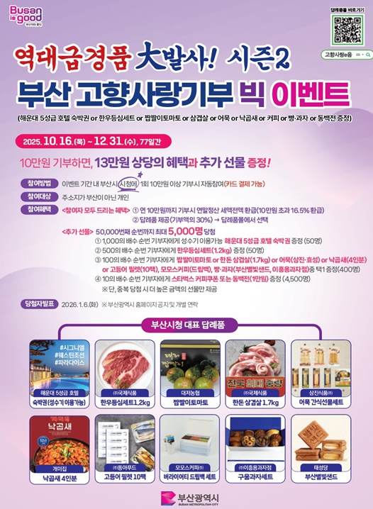 [무한뉴스=최진수 기자] 부산시는 오늘(16일)부터 12월 31일까지 77일간, 고향사랑기부제 참여 확산을 위해 '역대급 경품 대발사 시즌2! 부산 고향사랑기부제 연말 빅 이벤트'를 개최한다고 밝혔다.