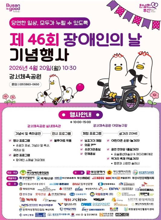 [무한뉴스=최진수 기자] 부산시는 오늘(20일) 오전 10시 30분, 강서체육공원 실내체육관에서 장애인에 대한 이해를 높이고 장애인과 비장애인이 함께 공감하는 장을 마련하기 위해 '제46회 장애인의 날 기념행사'를 개최한다고 밝혔다.