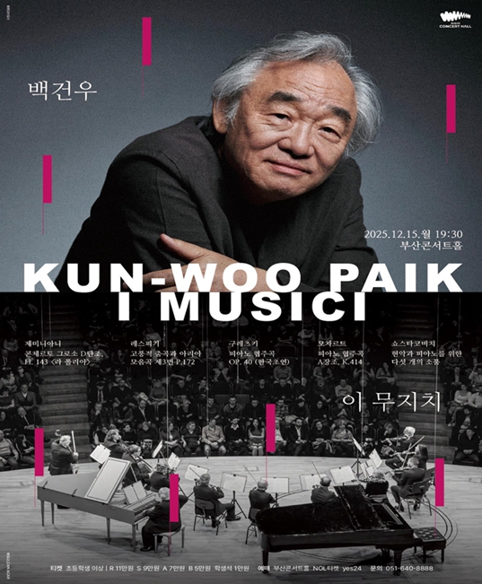 [무한뉴스=최진수 기자] 클래식부산은 오는 12월 15일 오후 7시 30분 부산콘서트홀에서 세계적인 피아니스트 '백건우'와 이탈리아 명문 현악합주단 '이 무지치(I Musici)'가 부산에서 첫 협연 무대 '백건우 앤드(·) 이 무지치'를 선보인다고 밝혔다.