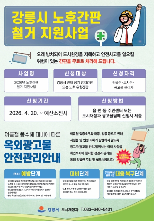[무한뉴스=정민정 기자] 강릉시는 안전사고를 예방하고 쾌적한 도시환경을 조성해 주민 만족도를 높이고자 '2026년 노후간판 철거 지원사업'을 시행한다.