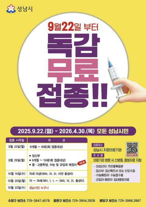 시 관계자는 “모든 시민 독감백신 무료 접종은 도내 31개 시군 중에선 성남시가 2023년 처음으로 도입해 올해로 3년 차”라면서 “인플루엔자 바이러스에 대한 면역력을 높여 시민의 건강한 일상생활을 지원하고 있다”고 말했다.