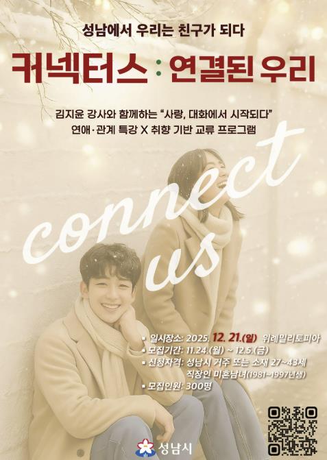 시 관계자는 “커넥터스는 청년들이 새로운 사람을 만나는 부담을 줄이고, 서로의 일상과 관심사를 공유하며 자연스럽게 연결될 수 있도록 추진하는 교류 행사”라면서 “혼자 와도 어느새 함께하게 되는 경험이 되길 바란다”고 말했다.