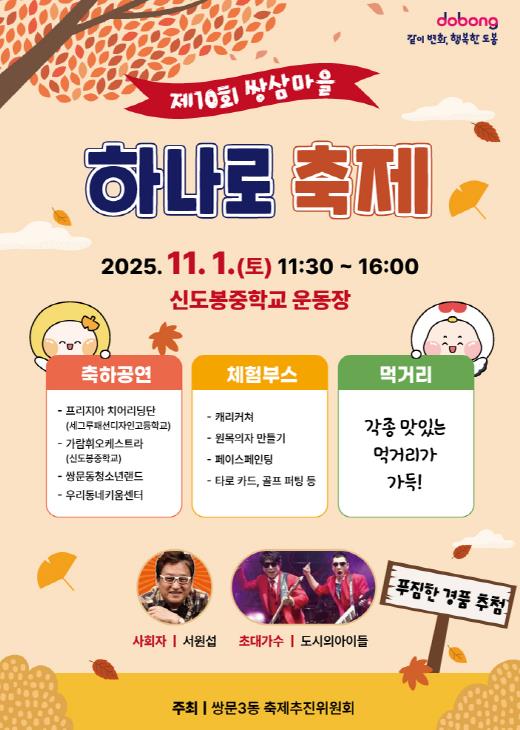 [무한뉴스=정승훈 기자] 서울 도봉구 쌍문3동이 오는 11월 1일 신도봉중학교 운동장에서 ‘제10회 쌍삼마을 하나로 축제’를 개최한다.