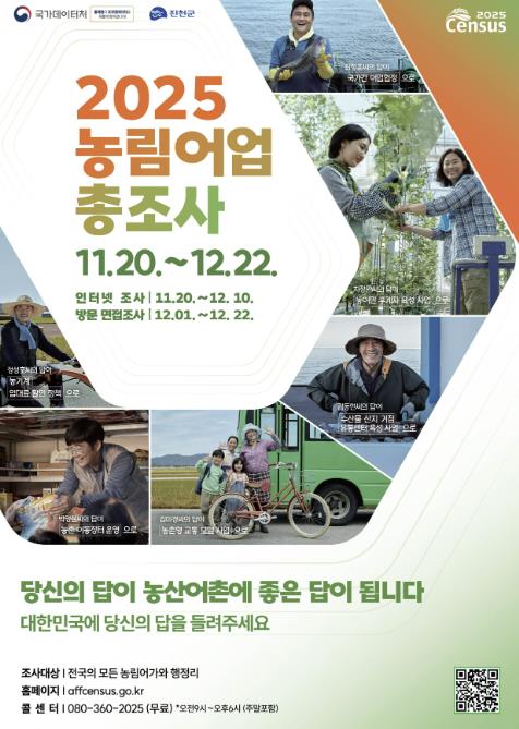 농림어업총조사는 국가데이터처가 주관하고 군이 실시하는 5년 주기 전국 단위 전수조사로, 농업‧임업‧어업 분야의 전반적인 실태를 파악해 향후 국가와 지방의 농정정책 수립에 활용되는 기초자료로 활용된다.