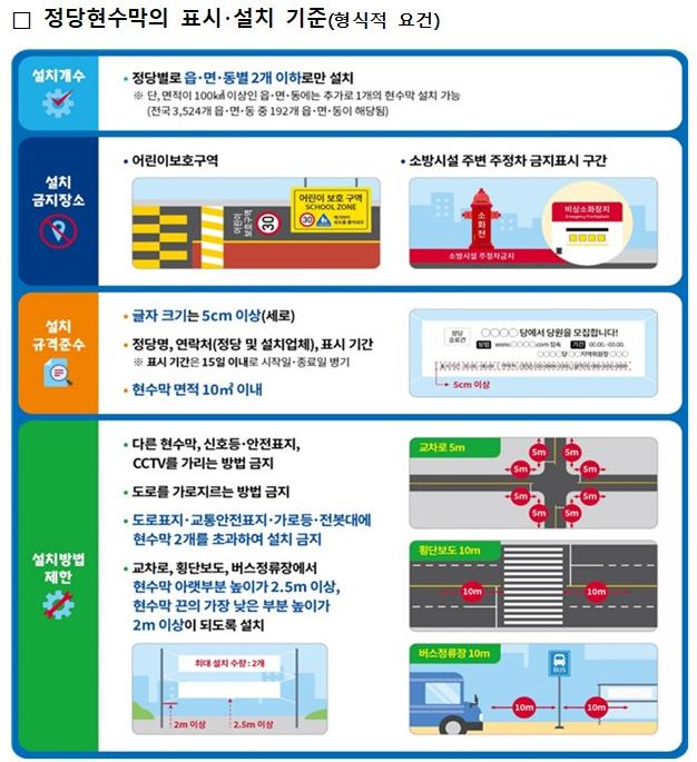 정당현수막은 도로를 가로질러 설치할 수 없고 다른 현수막이나 신호등, 안전표지, CCTV 등을 가려서는 안 되며, 교차로·횡단보도·버스정류장 부근에서는 현수막 아랫부분 높이가 2.5m 이상, 현수막 끈의 가장 낮은 부분 높이가 2m 이상이어야 한다. 위 규정들을 위반한 정당현수막의 경우 계고 없이 제거되고 정당 및 설치업체에 과태료가 부과된다.