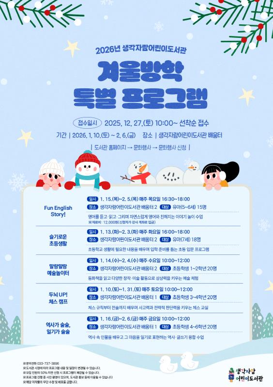 [무한뉴스=정민정 기자] 원주시 생각자람어린이도서관은 유아부터 초등학생을 대상으로 ‘겨울방학 특별 프로그램’을 운영한다.