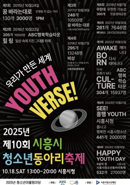 [무한뉴스=정승훈 기자] 10주년을 맞은 시흥시청소년동아리축제가 오는 10월 18일 시흥시청에서 개최된다. ‘우리가 만든 세계: YOUTHVERSE’를 주제로 열리는 이번 축제는 지난 10년간의 활동을 돌아보는 동시에 앞으로 축제가 나아가야 할 길을 내다보는 전환점이 될 것으로 보인다.