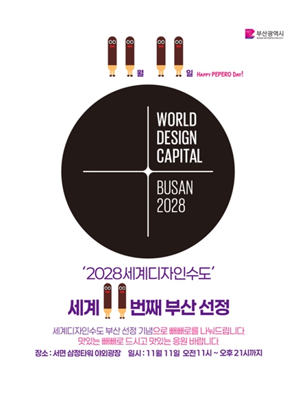 [무한뉴스=최진수 기자] 부산시는 내일(11일) 오전 11시부터 오후 9시까지 삼정타워 야외광장(부산진구 부전동)에서 롯데웰푸드와 '빼빼로데이(11의 날)×11번째 세계디자인수도 부산 2028' 공동 캠페인을 개최한다고 밝혔다.