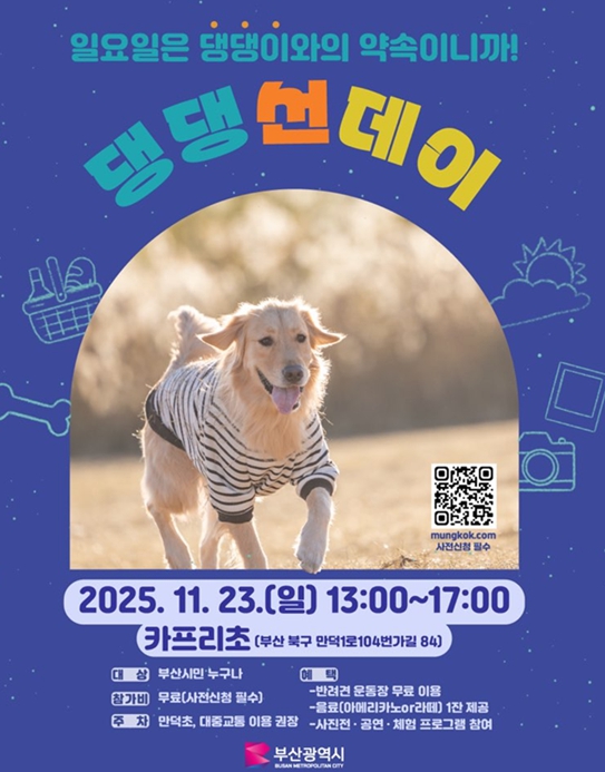 [무한뉴스=최진수 기자] 부산시는 오는 11월 23일 오후 1시부터 5시까지 카프리초(북구 만덕동 소재) 내 반려견 운동장에서 '댕댕 선데이(반려동물 동반 피크닉 체험 행사)'를 개최한다고 밝혔다.
