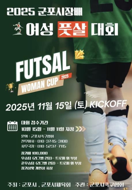 [무한뉴스=손성기 기자] 군포시는 여성 생활체육 참여 확대와 건전한 스포츠 문화 확산을 위해 ‘2025 군포시장배 여성 풋살대회’를 오는 11월 15일(토) 군포시 국민체육센터 축구장에서 개최한다.