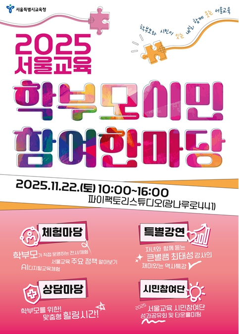 [무한뉴스=정승훈 기자] 서울특별시교육청은 ‘학부모와 시민이 잇는 내일, 함께 웃는 서울교육’을 슬로건으로 '서울교육 학부모․시민 참여 한마당'을 11월 22일 오전 10시부터 오후 4시까지 광진구 파이팩토리 스튜디오(광진구 광나루로 441)에서 개최한다.