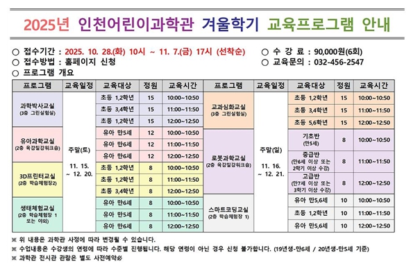 | ▲ 인천시설공단 인천어린이과학관은 이달 28일 오전 10시부터 「겨울학기 교육프로그램」의 접수를 시작한다. |
