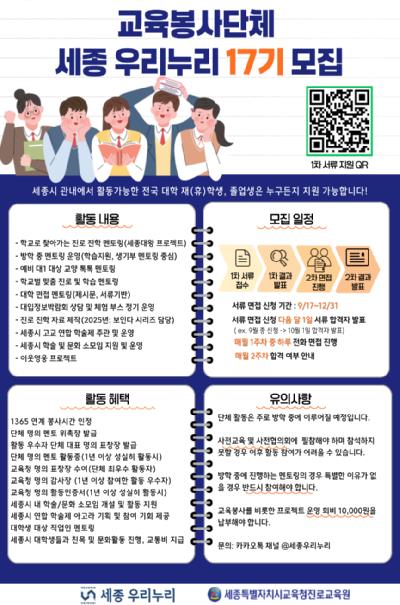 [무한뉴스=정민정 기자] 세종특별자치시교육청진로교육원과 협력하여 진로·진학 멘토링을 운영하는 ‘세종우리누리’가 ‘제17기 멘토 및 임원진’을 모집한다.