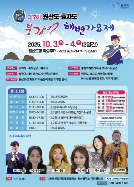 [무한뉴스=정민정 기자] 보령시가 주최하고 (사)원산도관광발전협의회가 주관하는 ‘제7회 원산도·효자도 붕장어 해변가요제’가 오는 10월 3일부터 4일까지 2일간 원산도항 특설무대에서 개최된다.
