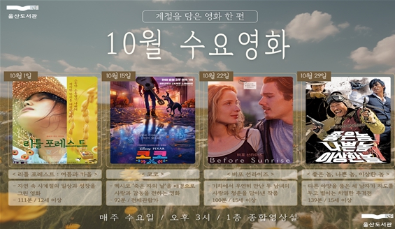 [무한뉴스=최진수 기자] 울산도서관이 10월 한 달간 매주 수요일 오후 3시 도서관 1층 종합영상실에서 ‘계절을 담은 영화 한 편’을 주제로 영화를 상영한다.