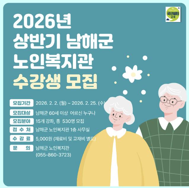 [무한뉴스=최진수 기자] 남해군 노인복지관은 2026년 상반기 프로그램 수강생을 2월 2일부터 25일까지 모집한다고 밝혔다.
