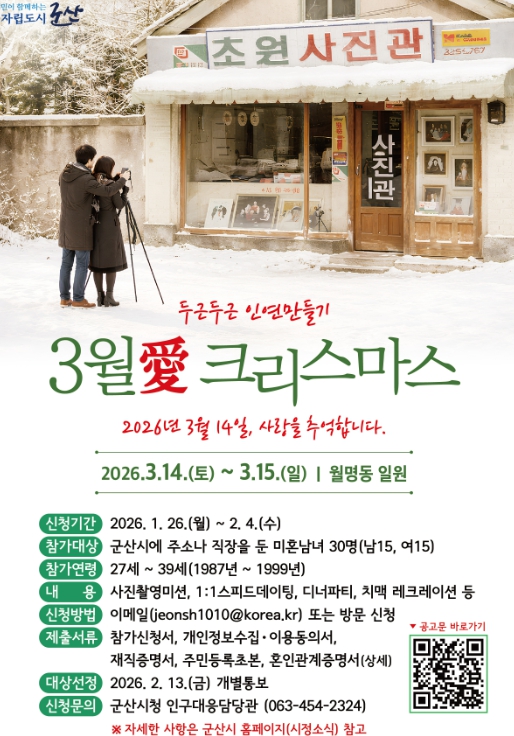 [무한뉴스=정민정 기자] 군산시가 2월 4일까지 선남선녀의 두근두근 인연만들기 행사 ‘3월愛 크리스마스’ 참가자를 모집한다.