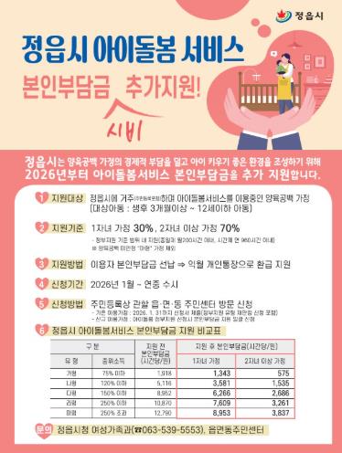 이번 사업의 핵심은 정부 지원을 받고도 부모가 추가로 지불해야 했던 비용을 정읍시가 대신 부담해 양육 가정의 실질적인 가계 지출을 줄여주는 데 있다.