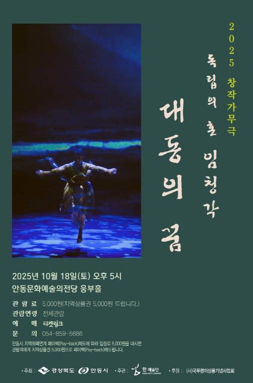 [무한뉴스=최진수 기자] 한예술단이 주최․주관하는 '2025 창작가무극 독립의 혼 임청각 ‘대동의 꿈’' 공연이 10월 18일 오후 5시, 안동문화예술의전당 웅부홀에서 개최된다.