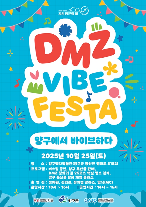 [무한뉴스=정민정 기자] 강원관광재단이 강원특별자치도, 양구군과 함께 오는 10월 25일 양구군 백자박물관 잔디마당에서 ‘디엠지 감성 축제(DMZ VIBE FESTA) 양구에서 바이브하다’를 개최한다고 밝혔다.