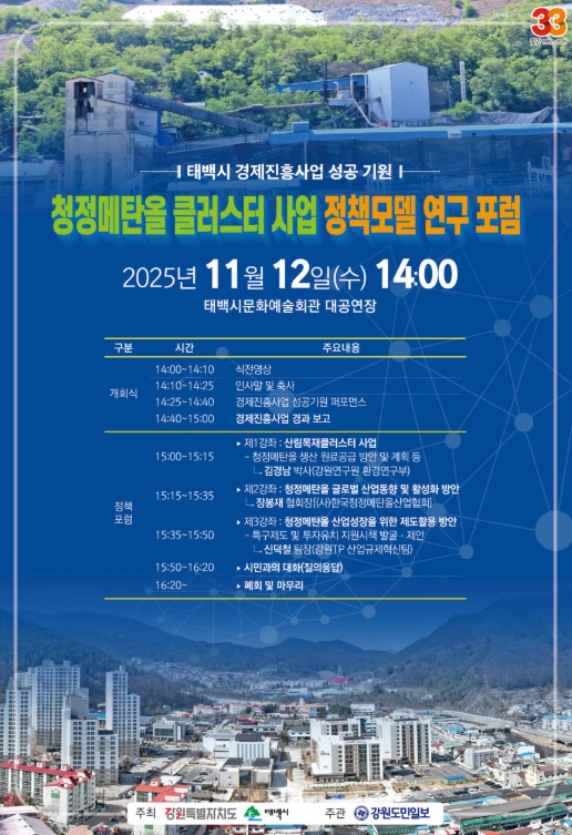 한편, 이번 포럼의 기반이 되는 태백시 경제진흥개발사업(청정메탄올 제조시설 구축)은 총사업비 3,540억 원 규모로, 지난 8월 예비타당성 조사를 최종 통과했다. 또한 2026년도 정부 예산에 74억 원이 반영되면서 사업이 본격화될 전망이다.