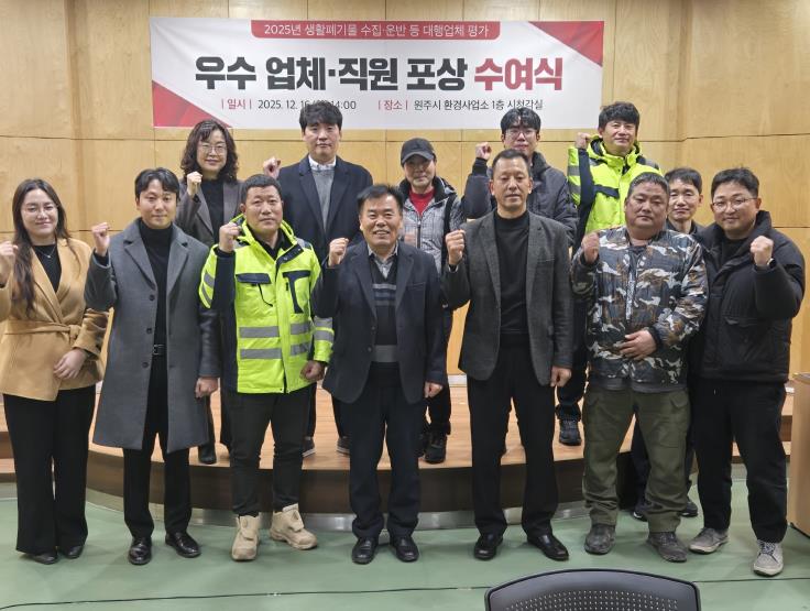 [무한뉴스=정민정 기자] 원주시는 12월 16일 '2025년 생활폐기물 수집ㆍ운반 대행업체 평가결과'에 따른 우수등급 업체 및 소속 직원을 대상으로 원주시장 상장 및 표창장을 수여한다.