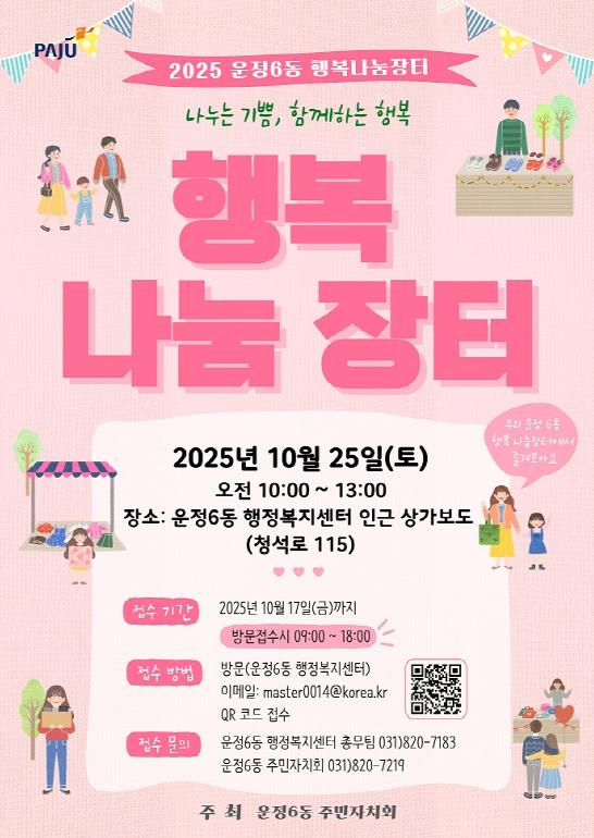 김찬주 운정6동 주민자치회장은 “행복나눔장터는 주민 모두가 즐기며 나누는 소통의 시간”이라며 “많은 주민들이 함께 참여해 지역사회의 따뜻한 나눔 문화를 만들어 가길 바란다”라고 전했다.