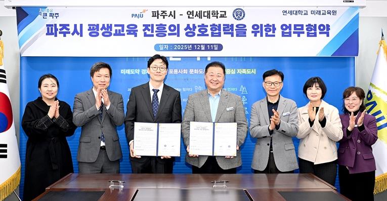 [무한뉴스=정승훈 기자] 파주시는 지난 11일 연세대학교 미래교육원과 ‘일생일대 프로젝트’의 공동 기획·운영을 위한 평생교육 진흥 업무협약(MOU)을 체결하고, 2026년 사업 확대를 위한 협력 체계를 본격 가동했다.