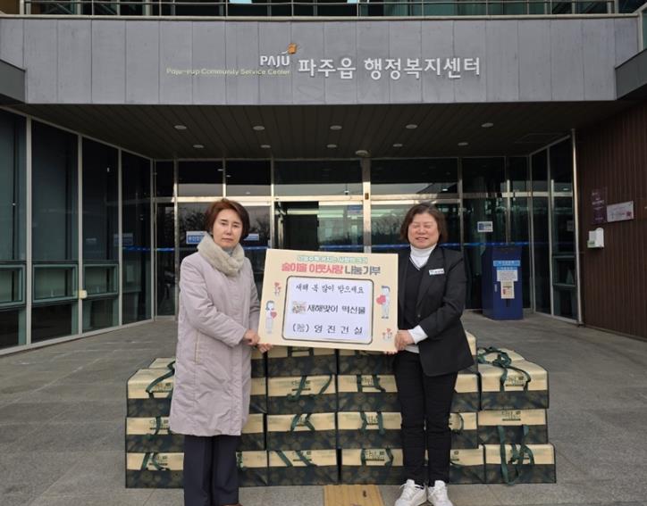 [무한뉴스=정승훈 기자] 파주시 파주읍은 지난 26일 영진건설㈜이 파주읍 행정복지센터를 방문해 지역 내 어려운 이웃들에게 따뜻한 사랑을 나누고자 떡 선물 꾸러미 40상자(200만 원 상당)를 기탁했다고 전했다.