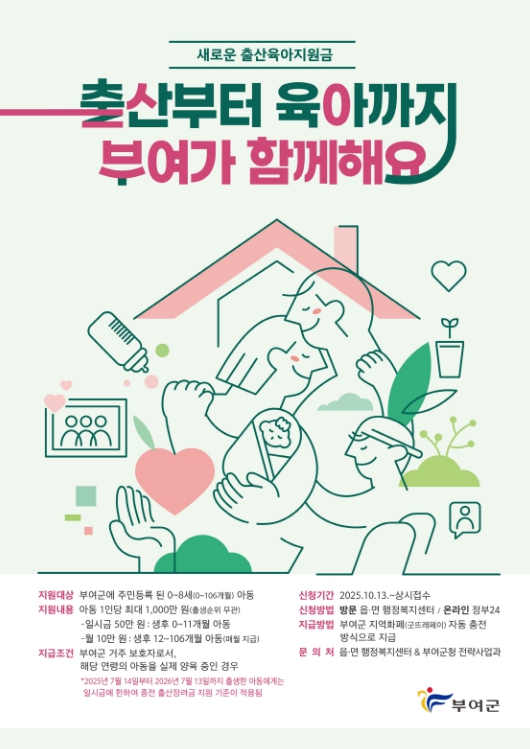 [무한뉴스=정민정 기자] 부여군이 저출산 위기에 대응하기 위해 기존 출산장려금 제도를 ‘출산육아지원금’으로 전면 개편하고, 오는 10월 13일부터 신청을 시작한다.