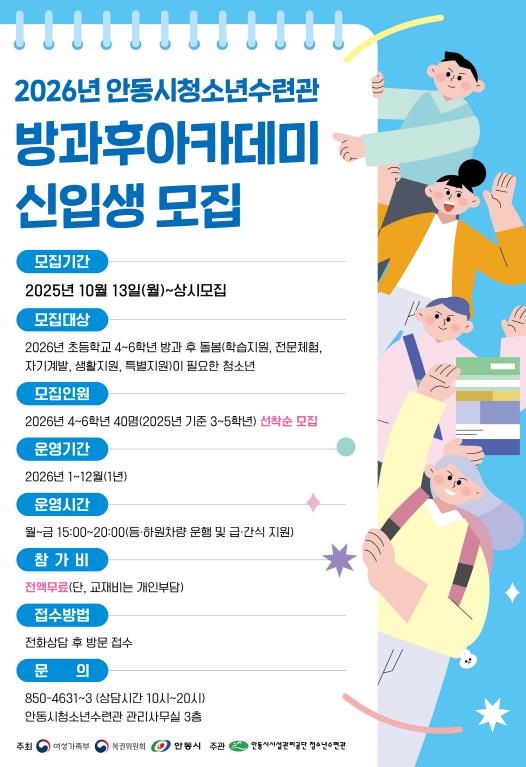 [무한뉴스=최진수 기자] 안동시시설관리공단이 운영하는 청소년수련관 방과후아카데미가 오는 10월 13일부터 2026년도 신입생 모집을 시작한다.