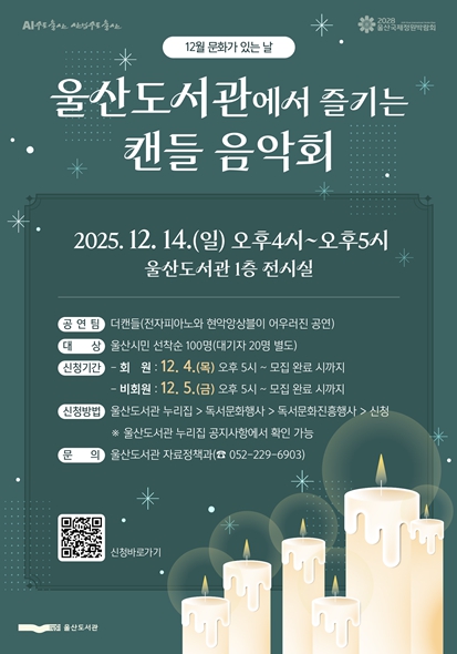 [무한뉴스=최진수 기자] 울산도서관은 12월 문화가 있는 날을 맞아 오는 12월 14일 ‘겨울 도서관 양초(캔들) 음악회’를 개최한다고 밝혔다.