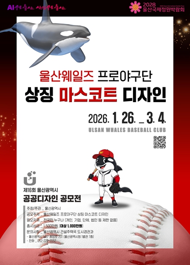 [무한뉴스=최진수 기자] 울산시는‘울산웨일즈 프로야구단 상징 마스코트 디자인’을 공모 주제로‘제16회 울산광역시 공공디자인 공모전’을 개최한다고 밝혔다.