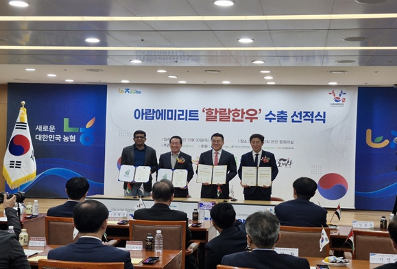 [무한뉴스=정민정 기자] 대한민국 축산물 브랜드경진대회에서 2019년, 2021년, 2023년 대통령상을 수상한 강원특별자치도 통합브랜드 ‘강원한우’가 10월 30일 서울 농협중앙회 본관에서 ‘강원한우 아랍에미리트(UAE) 수출 선적식’을 개최했다.