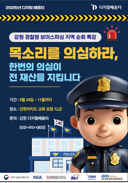 윤우영 강원특별자치도 행정국장은 “보이스피싱은 단순 범죄가 아니라 고령층의 삶을 위협하는 심각한 사회문제”라며 “추석 전후 취약 시기를 노리는 범죄에 맞서 현직 경찰관의 경험과 대응 요령을 생생히 전달하고, 디지털배움터를 통한 지속 학습 체계로 도민 스스로를 지킬 수 있는 힘을 키우겠다”고 밝혔다.
