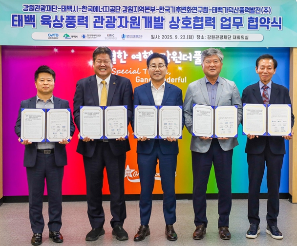 [무한뉴스=정민정 기자] 강원관광재단은 지난 9월 23일 태백시, 한국에너지공단 강원지역본부, 한국기후변화연구원, 태백가덕산풍력발전㈜과 함께 ‘육상풍력 관광자원 개발을 위한 상호 협력 협약’을 체결하고 폐광지역 관광의 새로운 미래를 열겠다고 밝혔다.