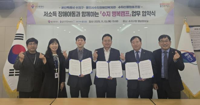 [무한뉴스=정윤식 기자] 용인특례시 수지구는 13일 용인시수지장애인복지관과 수지신용협동조합과 함께 저소득 장애아동의 복지 향상과 장애 인식 개선을 위한 ‘수지 행복캠프’ 추진 업무협약을 체결했다고 14일 밝혔다.