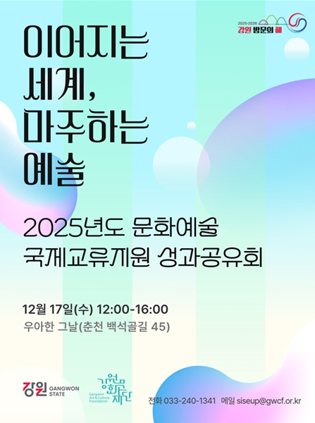 [무한뉴스=정민정 기자] 강원문화재단은 2025년도 문화예술 국제교류지원사업에 참여한 예술인들과 함께 12월 17일 춘천에서 성과공유회 '이어지는 세계, 마주하는 예술' 행사를 성황리에 마무리했다고 밝혔다.