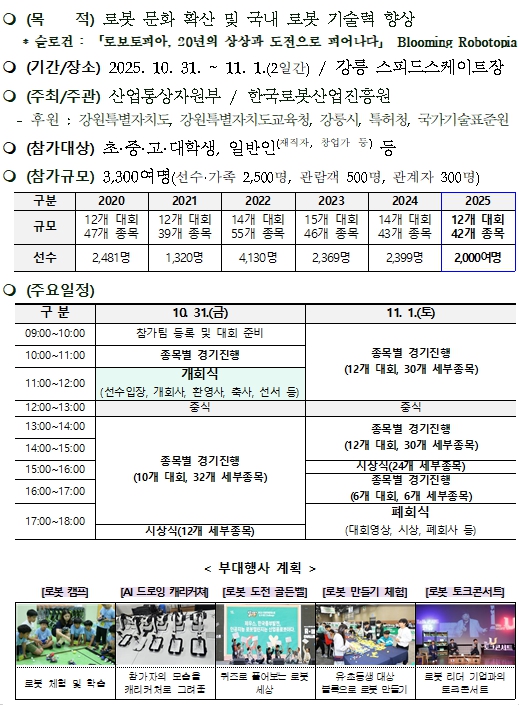 이번 대회에는 3,300여 명(선수 2,000명, 가족 및 관람객 1,300명) 이 참가하는 국내 최대 규모의 로봇 대회로, 초·중·고등학생부터 대학·일반부까지 폭넓게 참여한다.