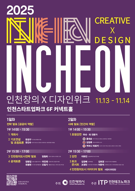 [무한뉴스=정승훈 기자] 인천광역시는 오는 11월 13일부터 14일까지 이틀간 인천스타트업파크 커넥트홀에서 '2025 인천창의X디자인위크'를 개최한다고 밝혔다.