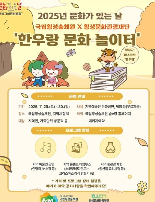[무한뉴스=정민정 기자] 산림청 한국산림복지진흥원국립횡성숲체원은 오는 11월 29일부터 30일까지 횡성 지역민 및 문화소외계층을 대상으로 ‘25년 강원특별자치도 문화가 있는 날 구석구석문화배달사업 – 한우랑 문화놀이터’를 개최한다고 밝혔다.