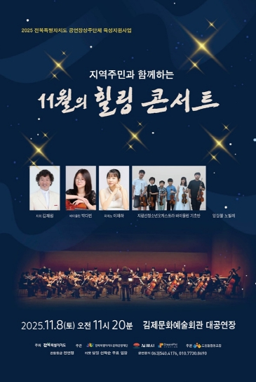 [무한뉴스=정민정 기자] 단순한 공연을 넘어 음악을 통해 세대와 지역이 함께 성장하고 소통하는 '지역주민과 함께하는 11월의 힐링 콘서트'가 오는 8일 오전 11시 20분 김제문화예술회관 대공연장에서 펼쳐진다.