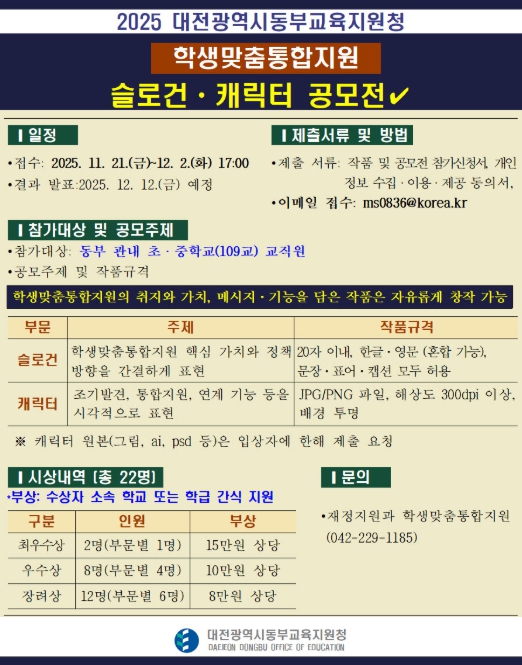 대전동부교육지원청 이상진 재정지원과장은 “이번 슬로건과 캐릭터 공모전을 통해 정책의 핵심 가치가 시각적으로 공유되고, 학교 현장에서 보다 친숙하고 실천 가능한 학생맞춤형 지원 문화 확산의 기반이 될 것으로 기대한다”고 말했다.