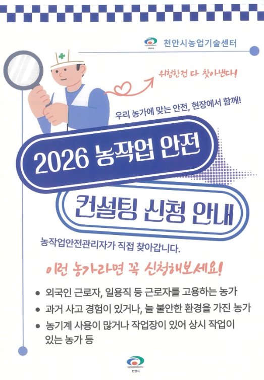 [무한뉴스=정민정 기자] 천안시농업기술센터는 오는 3월까지 ‘농작업 안전컨설팅’ 참여 농가를 모집한다고 16일 밝혔다.