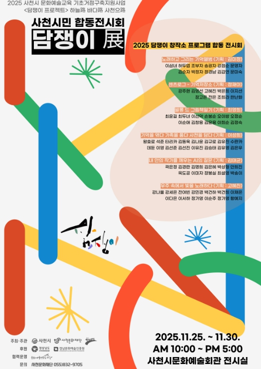 [무한뉴스=최진수 기자] 사천문화재단은 오는 11월 25일부터 11월 30일까지 2025 사천시문화예술회관 전시실에서 담쟁이 프로젝트 합동 전시회 '담쟁이 展'을 개최한다.